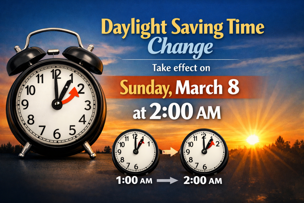 The time change will take effect on Sunday, March 8 at 2:00 AM, when clocks will advance to 3:00 AM. Please kindly ensure that your clocks and electronic devices are adjusted accordingly so that classes, meetings, and other scheduled activities can proceed smoothly.